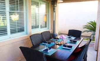 Step into your private outdoor haven, perfectly set up for relaxation and entertainment. Overlooking the scenic golf course, the backyard patio invites you to enjoy stunning views from sunrise to sunset. Gather around the stylish fire table for cozy conversations under the stars or cook up delicious meals on the BBQ grill. There s a large outdoor dining table with seating for six, ideal for alfresco dining or a leisurely breakfast. Lawn games and a welcoming setup make this space perfect for family fun or unwinding with friends, all while enjoying the fresh air and beautiful landscape