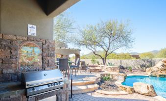 Desert Mountain Majesty's accommodations offer a well-appointed sleeping arrangement. The primary bedroom in the main house features a lavish King-size bed, a smart TV, and an en-suite bathroom complete with dual sinks, a roomy walk-in shower, and a jetted tub for ultimate relaxation. The second bedroom, also in the main house, includes a King-size bed and its own private bathroom. The third bedroom provides a Queen bed, a smart TV, and an en-suite bathroom as well. Additionally, the fourth bedroom, located in the separate guest casita, comes with a King-size bed, smart TV, and en-suite bathroom, ensuring that all guests enjoy both comfort and privacy during their stay.