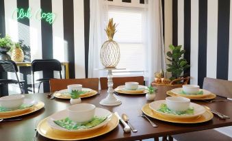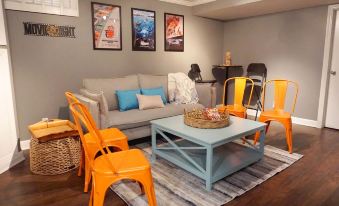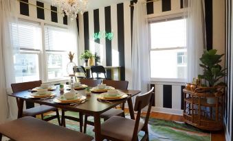 In our vibrant main living space, you will find comfortable seating with a 50 inch Roku Smart TV for entertainment and a lively formal dining room to enjoy meals with your friends and family. The fully stocked kitchen is complete with all essential cooking supplies like pots & pans, sheet trays, measuring spoons/cups, grilling utensils, serving dishes, coffee maker, electric kettle, toaster, air fryer, microwave, & dishwasher.