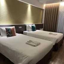 선셋비치 바로앞이고 아메리칸빌리지 옆이라 이것저것 위치는 좋았으나 sea view라고 해서 기대했는데 프론트 윗쪽의 끝의방이어서 테라스문 여니 비치는 다 짤려서 잘 보이지도 않았어요.정말 짜증났어요.다른 비치가 보이는 방을 배정받던가 아니면 비치가 보이는 호텔을 이용하는게 나았습니다. 침실과 욕실,화장실,세면대는 각각 분리되어 있었는데 컨디션은 좋았습니다.다만 침대머리맡은 먼지가 좀 있어서 좀 그랬네요.
