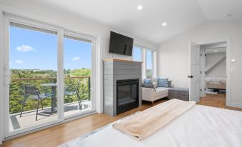 The primary bedroom is the crown jewel of this home! The light wood floor, the peaked white ceilings and the large windows let the Cape Cod sunlight in and create the ideal summer environment! The king bed is so inviting as it faces a large, flat screen SmartTV, gas fireplace (for off season use), small sitting area and access to the outdoor deck with peek-a-boo ocean views! Bring your coffee out on the deck to the bistro table and watch the sun rise! Does it get any better than that!?