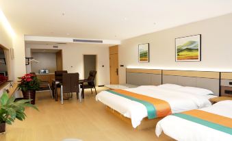 The homestay has a total of 10 guest rooms on the 3rd floor, all with windows and a variety of room types, including king rooms, twin rooms, family rooms and business suites (equipped with mahjong tables and kitchens). Each room is furnished with sofas, round coffee tables and desks. The guest rooms are equipped with 6cm soundproof doors, smart locks and a whole-house intelligent central water system. Additionally, there is a high-end guest control system developed by a Shenzhen electronics company (with an investment of over 3,000 yuan per room), which allows guests to check the time, play music and view the weather.