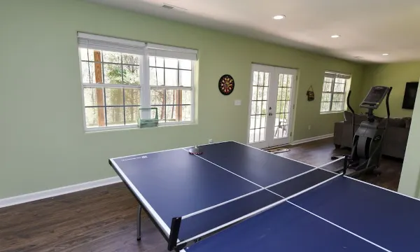 Back inside, enjoy a game of darts or ping-pong in the game/fitness room on the lower level. Or work out on the elliptical machine.
