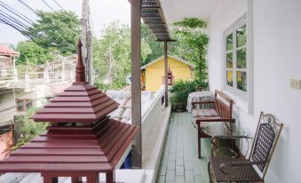 地理位置很好,在清邁古城裡麪,離塔佩門很近,晚上四周很安靜。我們訂的陽台房,房間很大,也很乾凈,小陽台有桌椅,坐着很舒適。缺點是衞生間很小,且有輕微異味,洗澡之後熱氣燻蒸異味更大一點,不過把衞生間門關上就聞不到了。房間電源插座有點少,wifi信號差,手機4G信號也差,大概附近基站少?沒有電梯,大箱子需要手提上樓。一樓有專門上鎖的行李存放處。按金400銖。前台服務很友好,總的來説還不錯,性價比也高,以後來清邁會繼續住這裏