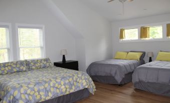 Our home provides enough beds for 8 guests to sleep comfortably. There is also a twin-sized futon provided, a foldable children's crib, and an ample amount of couch space. We recommend staying between 8-10 guests, but space allows for up to 12 adults. There are two full bathrooms, both providing showers that accommodate the taller than average guest. Our master bathroom has a shower/tub combo, our upstairs bathroom has a walk-in shower. As well as open yard space, we also provide a firepit and grill for your FULL summer experience. There is also no need to worry about parking. The house provides driveway space that can fit at least 8 vehicles, or even more if you are any good at Tetris! You will find an abundance of entertainment provided throughout our home including games, puzzles, FREE cable and WiFi, and smart TV's in each room. On top of that there is a spacious screened in 3 seasons room, and an outdoor dining set on our large back deck.