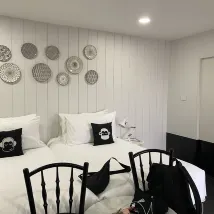 침대가 푹신하고 2층에 묵었는데 계단이 올라가고 내려가는 방이 옆에 있어서 잠을 잘 못잤습니다. 소리가 꽤 큽니다. 객실에는 편의시설도 많고 넷플릭스를 볼 수 있는 TV도 있고, 욕실도 그리 크지 않고 딱 적당한 크기입니다. 하지만 직원들은 밤새도록 거기에 없었고, 밖에는 경비원들만 있었습니다.