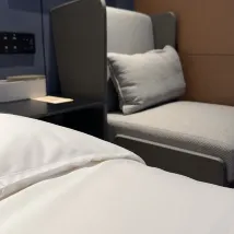 방이 넓고 침구도 편안해요. 커튼을 닫으면 완전히 어두워질 수 있다는 점이요. 눈부신 LED 조명이 있어서 잠을 자기에도 정말 편해요.