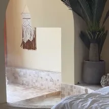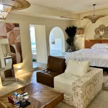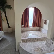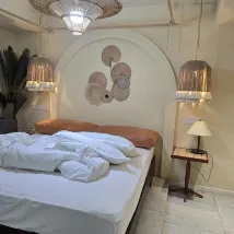 이 객실, 특히 온천탕 사진을 보고 바로 매료되었습니다. 저희는 둘뿐이었기에 넓은 침대가 딱 좋았습니다. 서너 명이면 동굴 객실을 예약하세요. 객실 인테리어는 사진과 똑같아서 실망하지 않으실 겁니다.