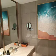 호텔 객실의 욕실은 건습 분리가 잘 되어 있어 좋았습니다. 샤워실과 화장실이 각각 왼쪽과 오른쪽에 독립적으로 배치되어 있어서 서로 방해받지 않고 편리하게 사용할 수 있었어요. 세면대도 넓어서 세면도구를 비롯해 여러 물건을 올려두기 충분했고, 세면대 아래에는 수건, 목욕 타월, 헤어드라이어가 잘 구비되어 있었습니다. 특히 세면대 바로 옆에 큰 전신 거울이 있어서 외출 전 옷차림을 점검하기 정말 유용했어요! ㅎㅎ