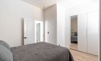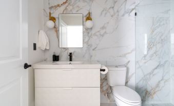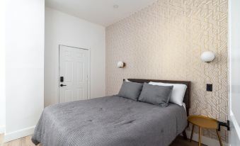 We tried to strike a perfect balance between the original character of the property with a mid-century modern bedroom (1 Queen Bed), luxurious bathroom with a curbless shower, lovely wood floors, granite waterfall countertops, a dining table, breakfast bar, high 10ft ceilings throughout, a nicely equipped kitchen, tons of natural light, full-length mirrors too for getting ready to go out and one of the nicest, largest private patios in all of Downtown.