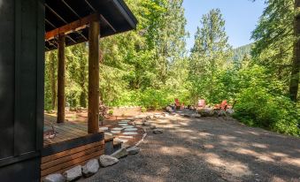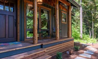 Carefully curated and thoughtfully designed, this little cabin is decorated with art and furniture from local artisans. The cabin has an open floor plan with an extra cozy sleeping loft equipped with a queen sized bed, comfy reading chair and a TV for watching movies. The living room has a comfortable plush sofa and perfect views while lounging by the wood-burning stove. The kitchenette offers you everything you need to dine-in — an electric oven/range, toaster, and coffee maker. The outside space features a large outdoor fire pit with beautiful views of the forest and ZigZag mountain.