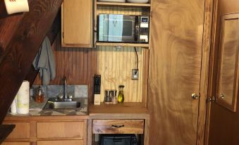The tiny house has a total of 300 sq. ft and is an A-frame. There is a deck, partially covered. Nothing fancy here but it has everything needed for a comfortable stay. Cozy you might say. AC and heat of course. Understand, with such limited space everything is small. (except the bed! it's a queen, some things can not be compromised!) Amenities include a small Mr. Coffee, french press, coffee grinder, and electric kettle. (coffee beans, earl gray tea and the fixins' are provided) For indoor cooking there is a microwave, toaster oven, “Liddle Griddle” and mini crock pot. On the deck is a gas grill with a side burner. There is a fire ring to the front of the cabin and long sausage/dog forks as well as a burger/fish/anything else basket for open fire cooking. Yum (one nights firewood is provided)