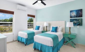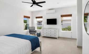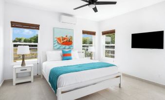 Welcome to our vibrant three-bedroom villa with a private pool, just a short walk from the beach. This spacious retreat features colorful decor and comfortable furnishings, perfect for families or groups. The master suite includes a king-sized bed and en-suite bathroom, while two additional bedrooms offer a queen-sized bed and two twin sized.