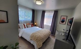 Groups up to six allowed. Sleeping options are the king or queen bed in each private bedroom (each room with its own climate control), and the queen sofa sleeper in living room. Seating for six in the formal dining room, and two more at the locally sourced cedar bartop. Also notice the custom wood accent wall. The remodeled kitchen has everything a chef needs. New fridge has an ice maker, with filter pitcher provided, and a new dishwasher for fast clean ups. Get the day started with the K-cup coffee and tea station, add a French press for serious grounds, and indulge in the free breakfast station with waffle maker, syrup and pankake mix. Don't forget the outdoor BBQ and picnic table, grill up any dish any time of year. Washer and dryer adjacent to kitchen. Heating and cooling via a new ductless mini split system, keeps temps perfect in all spaces.