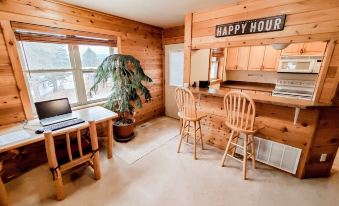 This 3000 sq/ft "cabin" has plenty of space to accommodate your large group while still giving everyone their space; it has 2 kitchens and separate lounge spaces. The cozy, yet open, living room and dining room are the perfect space to bring everyone together around the fireplace, a board game, or that home cooked meal. Speaking of, the large fully equipped main kitchen has 2 ovens, high-end appliances, and is well stocked to prepare a feast for your family. The dining area and bar table has seating for 12. There is a second fully stocked kitchen, if your groups need some alone time, or if you just want to make it the cocktail bar for happy hour. That side of the house also has a den with leather couches to kick back in and watch our large flat screen TV (access to Hulu, Netflix, Amazon Prime, Disney+, ESPN+, and DVDs.).
