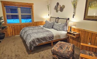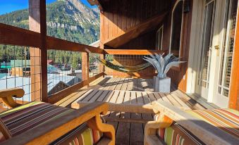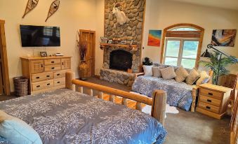 In the master bedroom, French doors lead to a private balcony deck with a hammock and lounge chairs- a great place to enjoy your coffee with a view of Republic Peak. The over-sized king log bed will make you feel like a king next to the beautiful stone fireplace with mountain goat centered above. Relax in the daybed and turn on the internet TV. The bathroom suite is the definition of pampered: complete with large tub, a massive 4 head shower, and laundry.