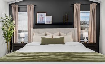 Twin Bedroom: A chalk wall adds a touch of creativity and fun for the kiddos (please note that the chalkboard is limited to the dark blue painted area). Both beds are adorned with whimsical flow canopies, sparking imagination and transporting the little ones to another world!