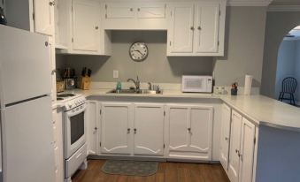 Kitchen Equipped with Keurig, Microwave, Fridge, Stove, Oven, Pots, Pans, Dishes, and Utensils