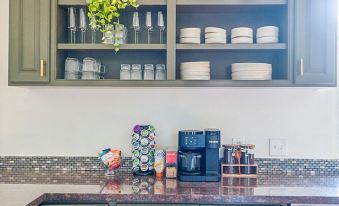 The front sitting area leads into the open and airy dining room, which is spacious enough for large family meals or gatherings with friends. The dining area flows seamlessly into the beautifully updated kitchen, which is fully stocked with everything you’ll need for your stay. Whether you're preparing a gourmet meal, brewing a fresh cup of coffee in the morning, or stocking the fridge and pantry with snacks, the kitchen is designed to accommodate every culinary need. Stainless steel appliances and ample counter space make meal prep a breeze.