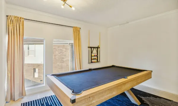 At the front of the house, the staircase takes you to the second floor, where the space splits into two wings. To the right, you'll find the game room, complete with a pool table ready for your next match. This side of the house also features a private bedroom with a queen bed and its own ensuite bathroom, complete with a walk-in shower—ideal for guests seeking extra privacy.
