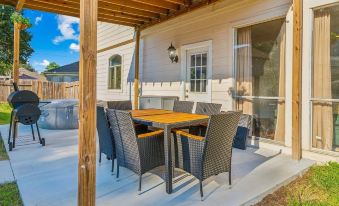 In addition to the hot tub and fire pit, the backyard includes a BBQ area complete with a charcoal grill and smoker for all your outdoor cooking needs. The outdoor dining space provides plenty of seating for meals al fresco, making this area ideal for BBQ season.