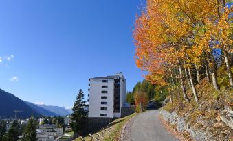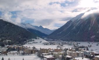 Davos: Apartment block "Guardaval (Utoring)". In the resort, in a central, quiet, sunny position on a slope, 1 km from the lake, 300 m from the skiing area. For shared use: indoor pool. In the house: reception, lounge with TV, WiFi, sauna (extra). Playroom, lift, storage room for skis, central heating system, washing machine (for shared use). Bread roll service and beverage service. Narrow motor access to the house. Roofed, parking (limited number of spaces, extra), communal covered parking (extra). Shop 300 m, restaurant 300 m, bus stop, railway station "Davos Dorf" 400 m, indoor swimming pool 1 km, bathing lake 1 km. Mountain railway, skisport facilities, slopes, ski school, sled run 1.5 km, cross country ski track, ice rink 300 m. Well-known ski regions can easily be reached: Parsenn 300 m, Jakobshorn 1.5 km. The building is located upstream of the resort of Parsenn mountain and offers beautiful view. Parking + garage (reservation on arrival). 1-room apartment 30 m2 on 5th floor. Rustic and cosy furnishings: living/dining room with 2 fold-away beds and cable TV (flat screen), radio. Exit to the balcony. Kitchen (2 hot plates, oven). Bath/WC. Balcony 7 m2, east facing position. Beautiful view of the mountains, the countryside and the resort. Facilities: Internet (WiFi, free). Parking. Please note: non-smokers only.