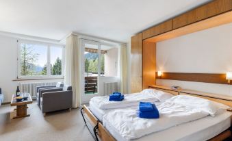 Davos Platz: Beautiful apartment block "Parkareal (Utoring)", built in 1966. 300 m from the centre, in a quiet, sunny, elevated position on a slope, 500 m from the skiing area, in a cul-de-sac, in the countryside. In the house: reception, lounge, sauna (extra). Solarium (extra). Table tennis, playroom, lift, storage room for skis, central heating system. Parking at the house, communal covered parking. Shop, grocery 300 m, supermarket, restaurant, bus stop, railway station 300 m, outdoor swimming pool 2.5 km, indoor swimming pool 2.5 km. Cable car, mountain railway, ski lift, ski bus stop 300 m, ski school 500 m, sled run 700 m, cross country ski track 500 m, ice rink 1.5 km. Hiking paths: Rienerhorn, Jakobshorn. Die Wohnungen mit Südlage ab dem 4. Stockwerk verfügen über eine herrliche Bergsicht. Parkplatz: im Sommer CHF 3.00/Tag, im Winter CHF 5.00/Tag. Einstellhalle: im Sommer CHF 5.00/Tag, im Winter CHF 8.00/Tag. Reservierung bei Ankunft. 1-room apartment 53 m2 on 7th floor. Partly renovated in 2023, cosy furnishings: living/dining room with 2 fold-away beds and cable TV (flat screen), radio. Exit to the balcony. Alcove with 2 beds. Small kitchen (oven, dishwasher, 4 ceramic glass hob hotplates, kettle). Shower/WC. Balcony. Beautiful view of the mountains, the countryside and the resort. Facilities: Internet (WiFi, free). Parking (extra). Please note: non-smokers only. Maximum 1 pet/ dog allowed. Instead of an enclosed bedroom, some sleeping areas are located in an open-plan area (gallery, alcove, etc.). 12516
