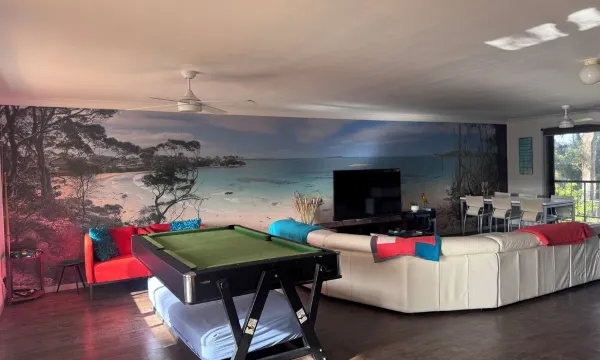 Huge open plan living room with balconies (north side with beach views and south side overlooking complex garden and tennis court) , large new couch, 6 seater dining table (easily made into 8 seater using adjustable kitchen bench stools if required), 65” smart TV, DVD player (with range of DVD’s) and pool table. Range of family books, puzzles and games for all ages.