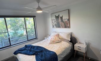 Second bedroom with queen bed and Hollywood mirror dressing table on middle floor. New carpet, ceiling fan, lights (including bedside x 2) and bedding.