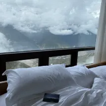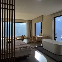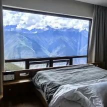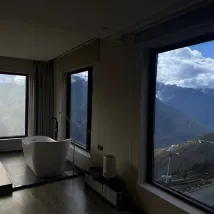 아침에 눈뜨면 일조금산이 보이고 싶었는데, 여러 호텔을 비교해보고 설산을 선택했는데, 자고 일어나니 방에서 메이리설산이 보이더라구요! 바닥에서 천장까지 이어지는 창문이 엄청 큽니다! 옥상에는 일조 금산 전망대가있어 사진 찍고 체크인하기에 경치가 좋아요! 호텔에는 레스토랑도 마련되어 있으며 서비스가 매우 세심합니다👌