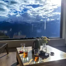 바닥에서 천장까지 이어지는 대형 유리를 통해 눈 덮인 산의 경치를 즐기며 앉아서 술을 마실 수 있습니다.