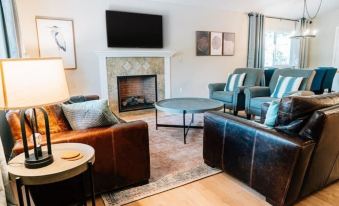 This home away from home is stocked with a hot tub, plush bedding, a gas fireplace, a soaking tub, two new 60" smart TVs, a fully equipped kitchen, high-speed Wi-Fi, & BBQ.