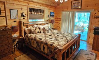 The Pinecone cabin is a newer single level cabin with modern conveniences in a rustic cozy private setting surrounded by forest, lawn, gardens and water features. The open concept living area is cozy and spacious with vaulted ceilings, a pellet stove, a reclining leather couch and a futon that can be used as a double bed. The greatroom also has a Lennox heating/air conditioning unit. The kitchen has new stainless steel appliances with a gas stove/oven, microwave, double fridge/freezer with ice/water in door, and dishwasher. The kitchen is well stocked with dishes/cookware, pantry food items, and small appliances, with a large pine dining table, and a door out to a wrap around deck with an outdoor grill.