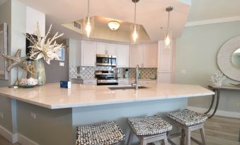 The interior spaces of Silver Shells St. Croix 1104 have been tastefully decorated with a trendy coastal theme. An open floor plan with luxury vinyl plank flooring gives the whole family or group space to relax together. The living area is beach-facing, features floor-to-ceiling windows and sliding glass doors, and has plenty of seating for everyone to gather around the flat-screen TV. The spacious beachfront balcony is perfectly furnished to allow for entertaining or dining while taking in spectacular views of the white sand beach and emerald waters. The dining area has seating for eight with additional seating at the breakfast bar. The fully equipped kitchen includes full-size stainless steel appliances and all the cookware and dishware you could need for creating memorable meals. In the main hallway is the laundry room complete with a full-size washer and dryer.