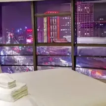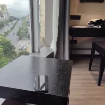 방이 넓고 깨끗하고 위생적이며 주변이 식사하기 편리하고 맞은편에 완다프라자가 있고 지하주차장도 있고 주차도 편리하고 조식도 제공됩니다. 천장부터 바닥까지 내려오는 대형 창문, 넓은 전망