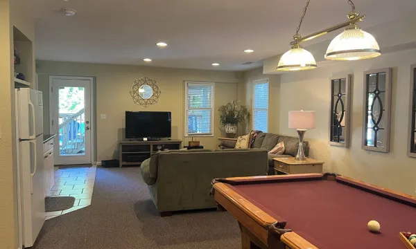 Bottom floor (2 bedrooms, 1 full bath): one bedroom with two bunks, one large bedroom with sitting area and attached bathroom (that shares into the game room)