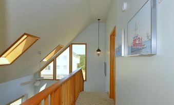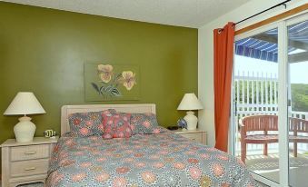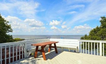 There are three sliding glass doors that lead out from the great room onto the deck that wraps around two sides of the house. The deck faces the Currituck Sound, so you can see the sun set over the water each evening. There is also an additional extension to the deck that holds a hot tub.