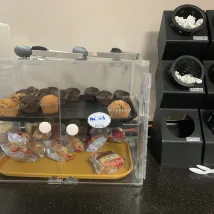 아침 식사는 차가운 음료와 따뜻한 음료, 과일, 요거트, 시리얼, 빵을 선택할 수 있는 셀프 서비스였고 카운터 끝에 토스터가 있었습니다. 식당은 넓고 햇살이 잘 들고요. 편안한 분위기였습니다.