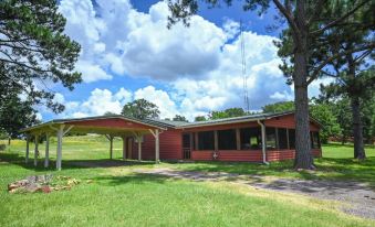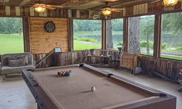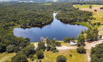 Lovely two-bedroom lake house overlooking the private 20-acre lake on a 300-acre ranch. There are various trails through pastures, woods, around the large lake, and to a smaller lake hidden in the woods. Fish from wooden piers, three paddle boats, or your own human powered watercraft. Pool table and dart board in patio. High speed internet provided. Ring cameras are around ranch work shed area.
