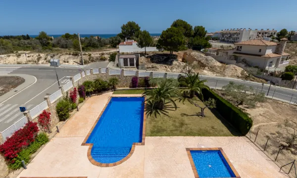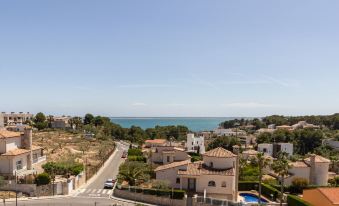 CAP ROIG 3 km from L'AMPOLLA: Cosy, comfortable apartment block "Anna". In a quiet, sunny position, 750 m from the sea, 750 m from the beach. For shared use: with natural garden, swimming pool angular (4 x 15 m, depth 1 - depth 80 cm, seasonal availability: 01.May. - 01.Oct.). Outdoor shower. In the house: WiFi, lift, air conditioning. Single garage, communal covered parking. Supermarket 1 km, bus stop 11 km, railway station 3 km, sandy beach "CALA MOROS" 750 m, shingle beach "MORRO DE GOS" 750 m. Golf course (15 hole) 45 km. Nearby attractions: Port Aventura 48 km, Parque natural Ports Tortosa Beseit 52 km, GR 92 1 km, Barcelona 190 km. Please note: car recommended. Groups of teenagers on request only. Railway line 100 m from the property. "Anna", 3-room apartment 79 m2. Comfortable and cosy furnishings: living/dining room with digital TV, international TV channels, air conditioning and forced-air heating. Exit to the balcony. 1 double bedroom with 1 french bed (135 cm, length 190 cm). 1 double bedroom with 2 beds (90 cm, length 190 cm). Open kitchen (oven, dishwasher, 4 ceramic glass hob hotplates, toaster, kettle, microwave, electric coffee machine) with bar. Bath/WC. Balcony furniture, deck chairs. Panoramic view of the sea and the mountains. Facilities: washing machine, iron, hair dryer. Internet (WiFi, free). Parking (roofed, 1 car). Suitable for families. Maximum 2 pets/ dogs allowed. HUTTE-002083