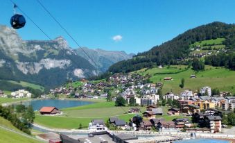 75 m2. More information by the provider: The very nicely and high quality furnished 3-room flat (75 m2) with 2 bathrooms is located on the 1st floor of a multi-family house at the Eugenisee with mountain view and is only in approx. 5 min. walking distance to the valley station of the cable cars Engelberg-Trübsse-Titlis. The cosy living room has an electric fireplace, a sofa, a large TV and free wifi. Cot and games available. The top modern, open kitchen is fully equipped with dishwasher, microwave, steamer and Dolce Gusto coffee machine. It has a bedroom with 2 single beds and a bedroom with a double bed an own tv. Modern bathroom/WC with bathtub. Modern shower/WC. South-facing balcony. Washing machine and dryer for shared use in the house. Car parking spaces in front of the house. Recreation room. Ski room. Pets not allowed. NON-SMOKING FLAT.