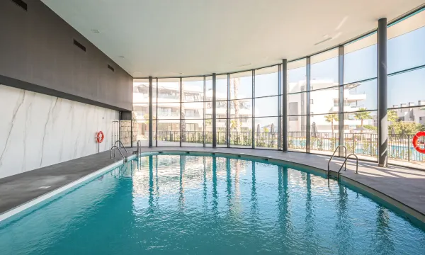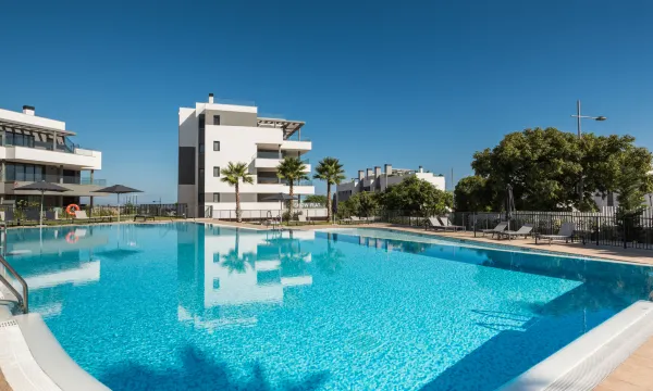 Modern, comfortable apartment block "Calma Blanca", built in 2021. In a central, busy, sunny position, 1.2 km from the sea, 1.2 km from the beach, south facing position. For shared use: 2 swimming pools, indoor pool heated (seasonal availability: 01.Jan. - 31.Dec. pool opening hours: 10:00-20:00). Unconventional pool shape. Shower/WC in the pool area. In the complex: fitness room, lift. Communal covered parking space n 01. Shop, supermarket, restaurant, bar, café, pedestrian zone 800 m, pub garden 300 m, bus stop "Avda Puerta de Mar" 400 m, sandy beach 1.3 km. Sports harbour 1 km, golf course (18 hole) 5 km, sports centre 300 m. Nearby attractions: Centro historico de Estepona 2 km. Object suitable for 6 adults. The owner does not accept any groups. The owner does not accept any youth groups. Neighbourhood highly sensitive to noise. Quietness and good behaviour expected. 4-room apartment 100 m2 on 2nd floor, south facing position. Object suitable for 6 adults. Modern and stylish furnishings: living/dining room with digital TV, air conditioning and forced-air heating. Exit to the terrace. 1 room with 1 french bed (150 cm, length 190 cm), bath/WC, hand-basin, air conditioning and forced-air heating. 1 room with 2 beds (90 cm, length 190 cm), air conditioning and forced-air heating. 1 room with 2 beds (90 cm, length 190 cm), air conditioning and forced-air heating. Open kitchen (oven, dishwasher, 3 ceramic glass hob hotplates, toaster, kettle, microwave, freezer, electric coffee machine). Shower/WC. Air-conditioning, forced-air heating. Natural stone floors. Terrace 50 m2. Terrace furniture, deck chairs (2), sitting area. Panoramic view of the sea and the city. Facilities: washing machine, iron, hair dryer. Internet (WiFi, free). Garage space n 01. Please note: suitable for families. Non-smokers only. VUT/MA/57377 ESFCTU0000290360006383990000000000000000VFT/MA/573775