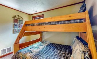 This 2-bedroom cabin has a main bedroom with a queen bed, the guest bedroom is perfect for kids with a bunkbed, full bottom, and twin top. A queen sofa sleeper in the Livingroom for additional sleeping. The hall bathroom has a spacious shower with a built-in seat.