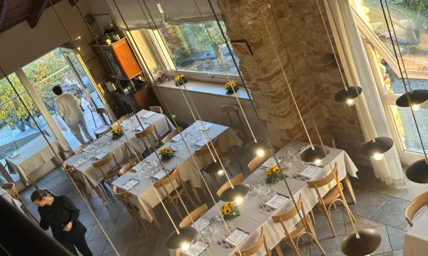Ristorante ricavato in un cascinale ristruttrato con gusto e coerenza ambientale. Vetrata con vista splendida sulle colline e i vigneti del Monferrato acquese. Cibo squisito, proposta golosa, servizio attento e veloce. Suggerirei un'illuminazione a colore completamente caldo, per maggiore omogeneità all'ambiente.