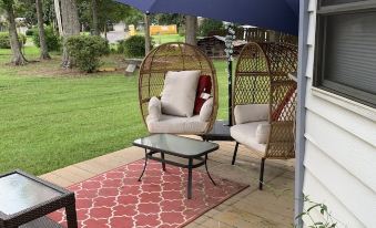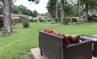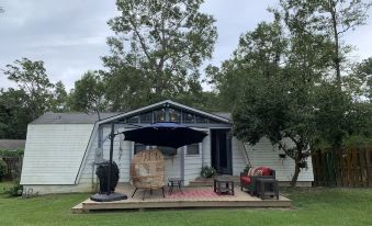 This unique newly renovated home has quirky charm with beamed ceilings and stain glass throughout. A thoughtful blend of modernized features to captivate the vacationing guest! Hardwood floors and a fabulous new kitchen, broad eating bar and inviting open floor plan. Beautiful large backyard with grill and comfy outdoor furniture. The home sits on a half acre lot in a quiet cul-de-sac a short walk from Fairhope downtown. Located in Fairhope‘s Fruit and Nut district , within walking distance of Mobile Bay. Sleeps five .The unique circular Silo room has a twin pull out bed making room for another guest!