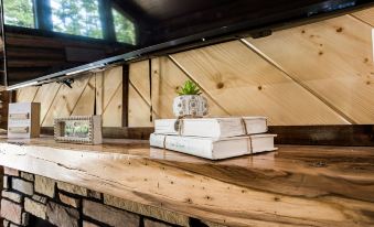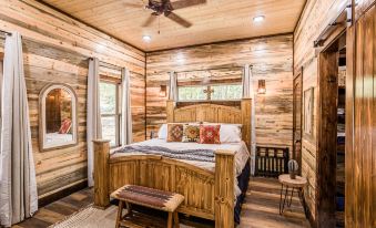 Calvert’s Copper Cabin is a new one bedroom, one bathroom cabin. As you enter, you’ll be greeted by a gorgeous open floorplan with high ceilings and beautiful blue pine tongue and groove walls. During your stay here, you’ll become well acquainted with the stunning living area complete with a gorgeous rocked gas fireplace, a smart TV atop the mantle, and comfortable sofa with a sleeper inside.