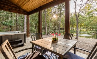 Outside, you’ll find a beautiful patio area. The patio is furnished with an outdoor dining table with seating for four and a gas grill, propane provided. You’re sure to enjoy the rocked gas-log fireplace and hot tub too! A cornhole game is provided as well. Down by the firepit you’ll find seating for four and a beautiful pond. Come relax at Calvert’s Copper Cabin!