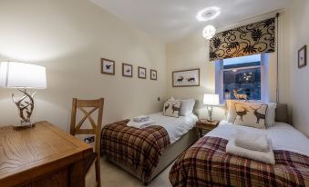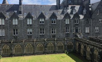 Sitting in the Moat House the Harris Apartment comprises two bedrooms and two bathrooms. With an open plan kitchen / diner / sitting room., it is on the second floor of the old hospice, with beautiful views overlooking the Cloister Garden with giant chess set and views through to Loch Ness.