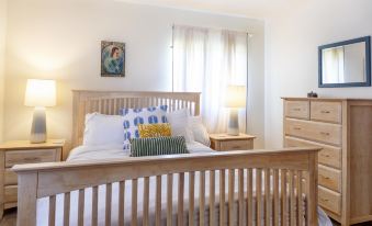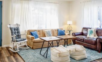 This luxurious vacation rental features 3 bedrooms with queen beds, two bathrooms, and a pullout couch, along with a living room, dining area, kitchen, and rec room -- and that’s just the inside! In the backyard, you’ll find a grill, an outdoor dining set for lunch in the sun and dinner under the stars, trees (and a tree swing), and the setup for a friendly game of horseshoes. In addition, the firepit is perfect for s’mores -- the best part of camping, but with all the comforts of home. In the shed, you’ll find all the makings of a great day at the beach: beach chairs, a picnic basket, and for the little ones, kids’ bikes and beach toys.