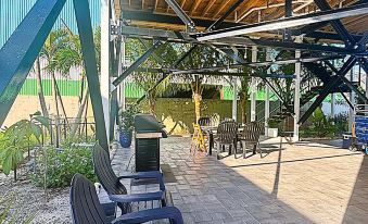 The property is adorned with lush tropical plants and palms, creating a serene, coastal atmosphere. You'll also have access to a gas grill for your outdoor cooking needs.